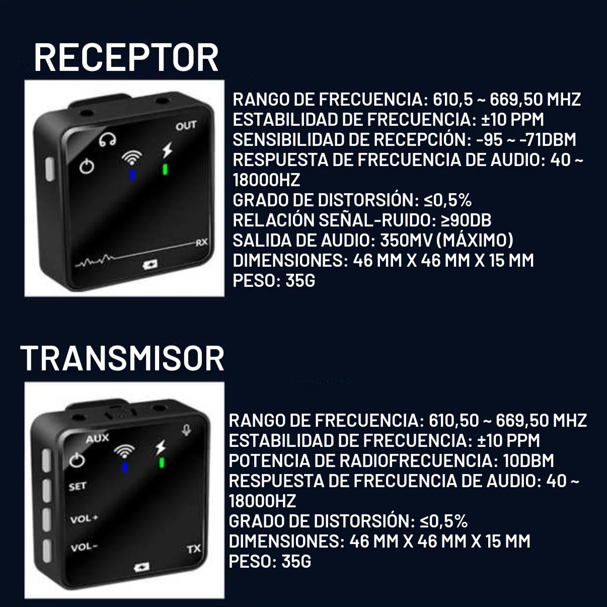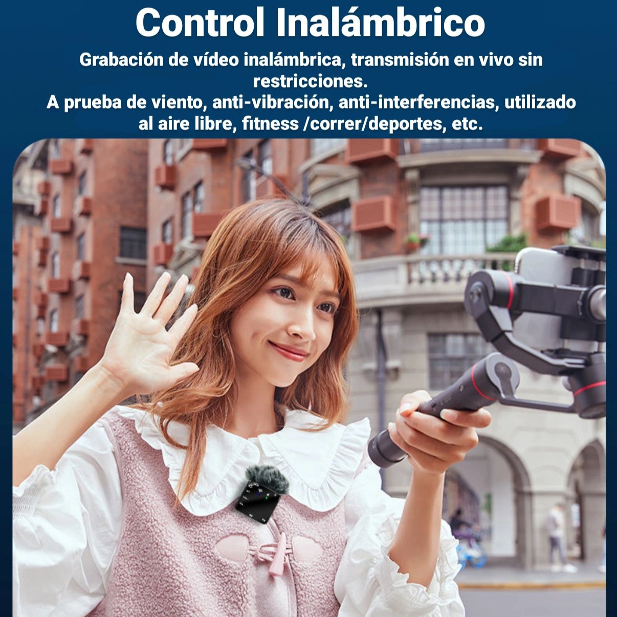 - Dual-canal inalámbrico / Lavalier de alta sensibilidad: Captura sonido claro y natural gracias a su micrófono de solapa (lavalier) sensible, que se puede colocar cerca de la fuente de sonido para minimizar ruido ambiente.